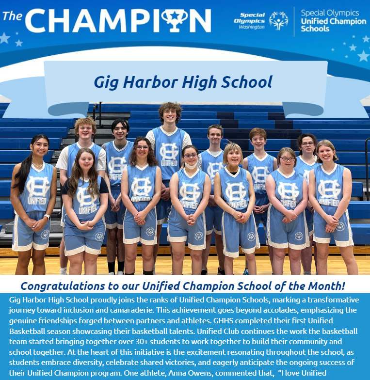 Congratulations to Gig Harbor High School for being named the Unified Champion School of the Month for March! GHHS students celebrated their first Unified Basketball season with more than 30 students coming together to play and build community, and many more partners showing up to support students on and off the court. Because of the popularity of basketball, GHHS will add Unified Soccer at their school next year.
